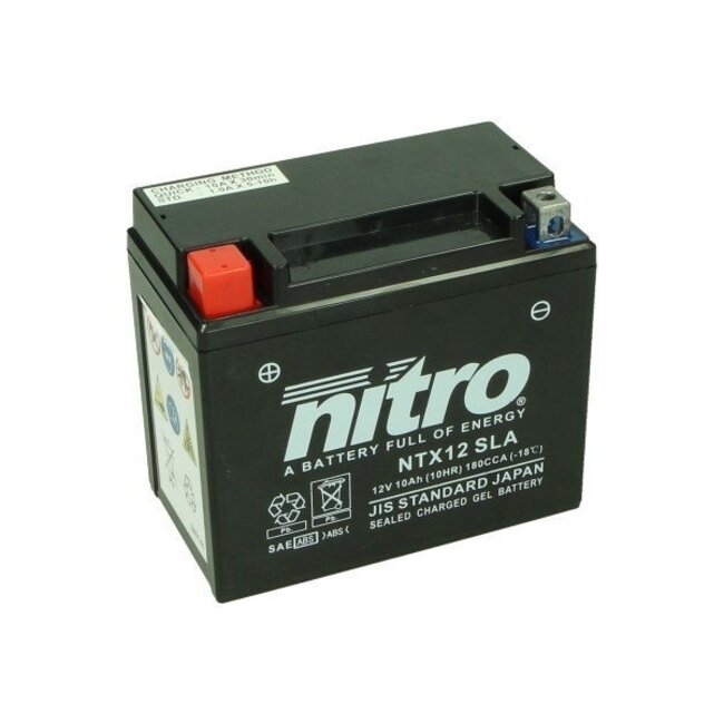 De Nitro accu NTX12 / YTX12 met een capaciteit van 10 Ah is een krachtige en onderhoudsvrije 12 V accu die verkrijgbaar is in zowel SLA (Sealed Lead Acid) als Gel‑technologie. Dankzij de robuuste bouw en betrouwbare prestaties is deze accu ideaal voor scooters, motorfietsen, quads en andere compacte voertuigen die een accu van dit formaat vereisen.