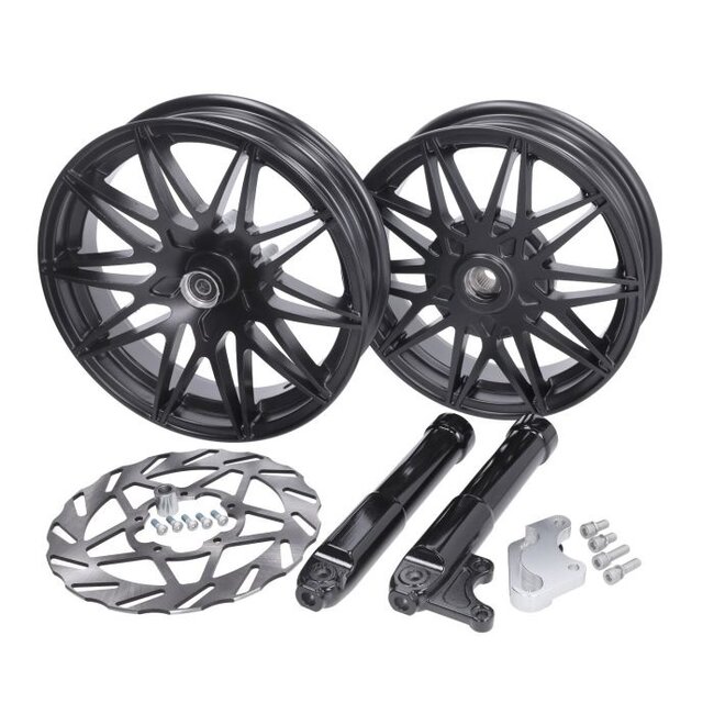 Deze velgset is volledig passend voor Piaggio Zip 2-takt, Zip 4-takt en Zip 2000 modellen. De grotere remschijf zorgt voor krachtigere en nauwkeurigere remprestaties, wat zeker van pas komt bij sportieve rijders. De verlengde onderpoten zorgen ervoor dat het grotere voorwiel netjes onder de voorkant past.